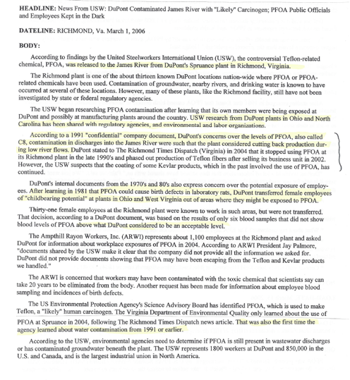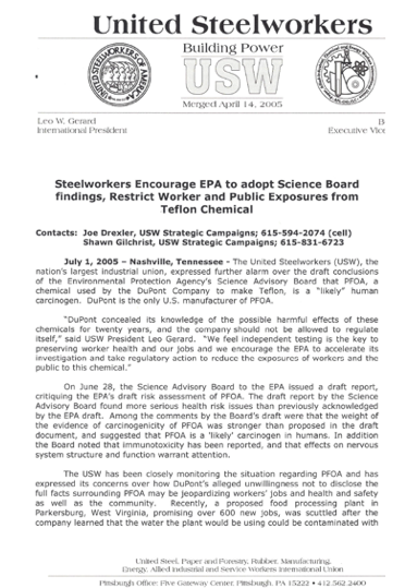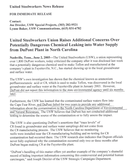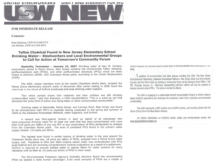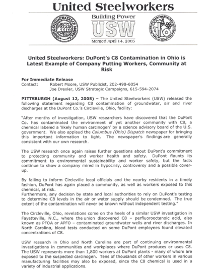 United Steelworkers: DuPont’s C8 contamination in Ohio putting workers, community at risk